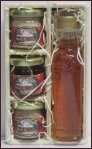 Beurre d'érable pur 50g, gelée à l'érable 40ml, sucre d'érable granulé pur 20g ( pot rond en verre ) et sirop d'érable pur 100ml ( bouteille Fiorentina ) |